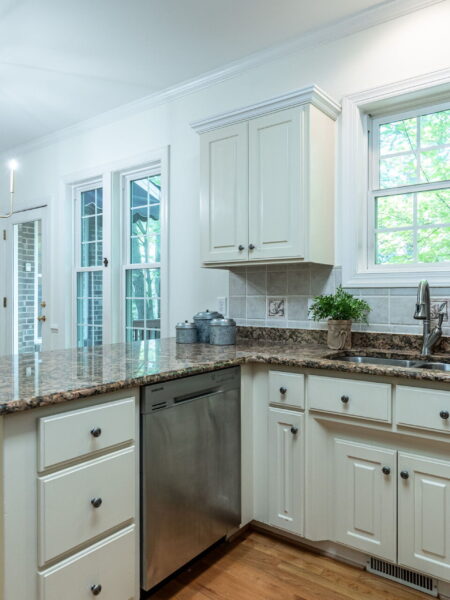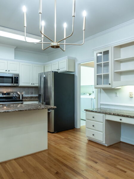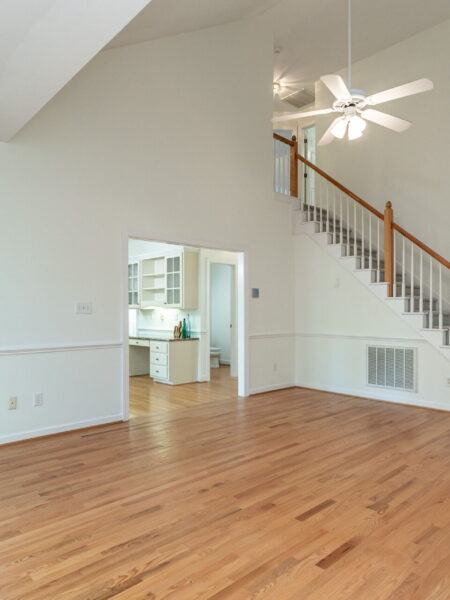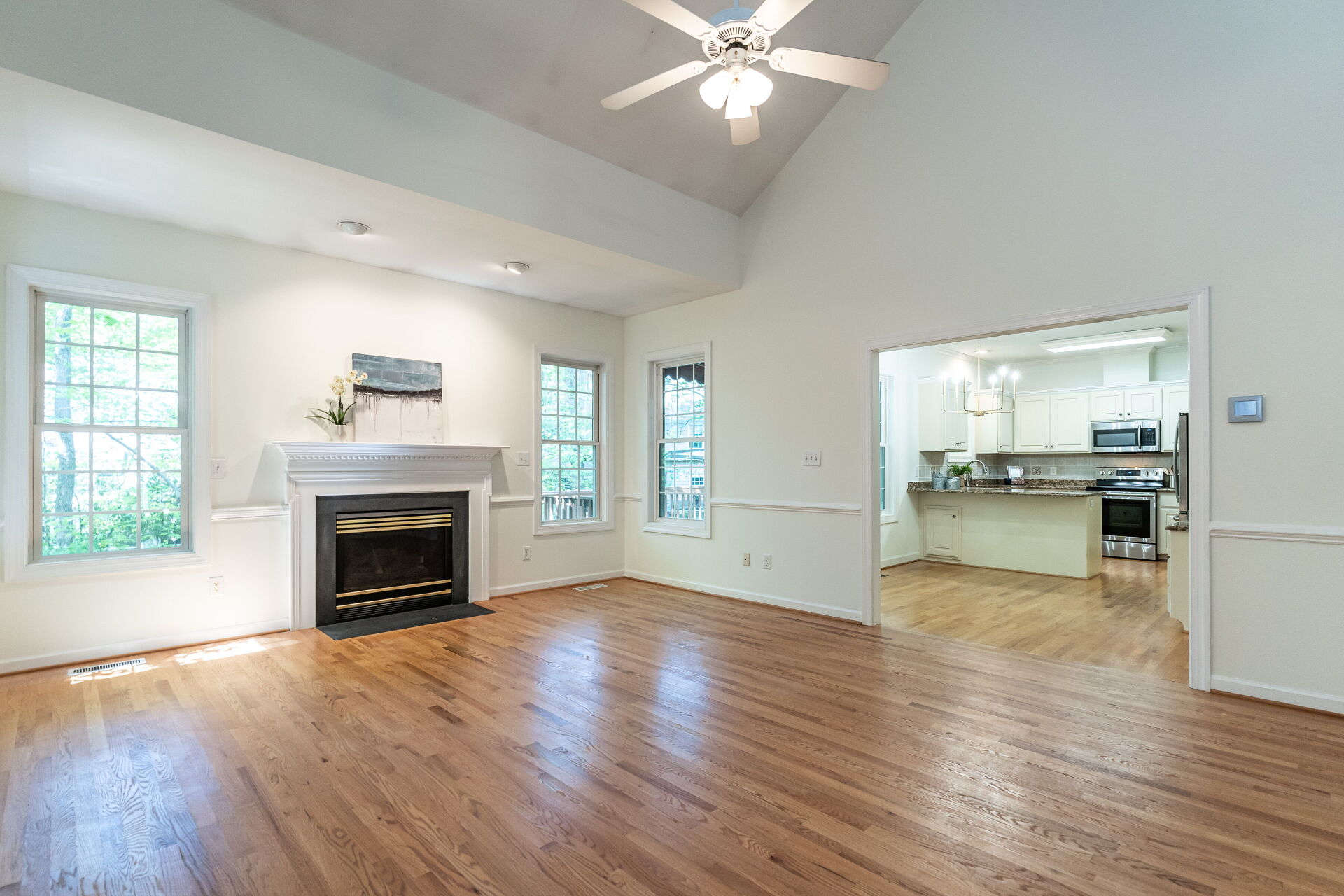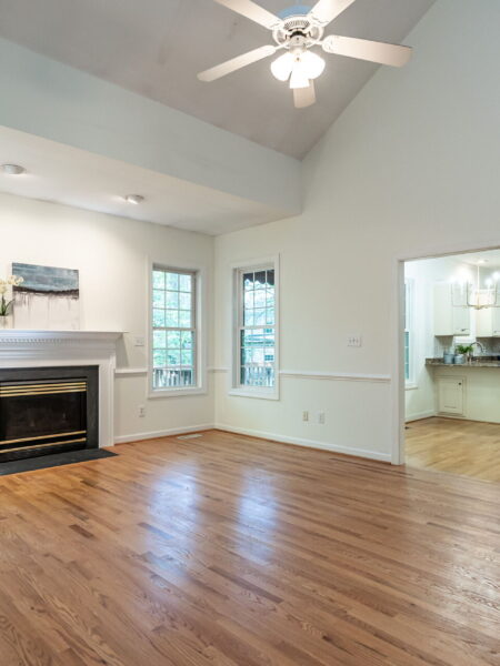 - Kitchen Connected to Living Room with Vaulted Ceiling + Fireplace