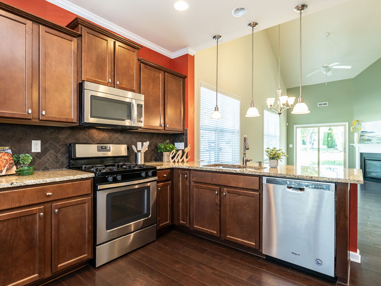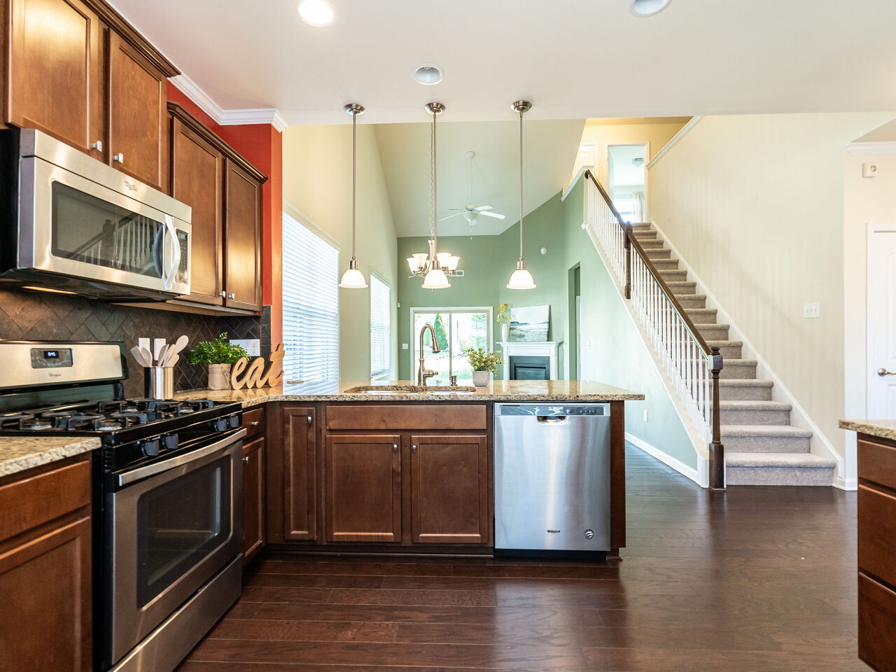 Thoughtful design greets you with a covered front porch, entry foyer with powder room and easy access to the utility room and open kitchen with breakfast bar. Refrigerator, washer, and dryer convey. Open dining and family room with a gas log fireplace provides for a warm environment suited for entertaining.