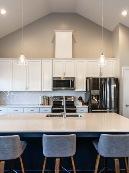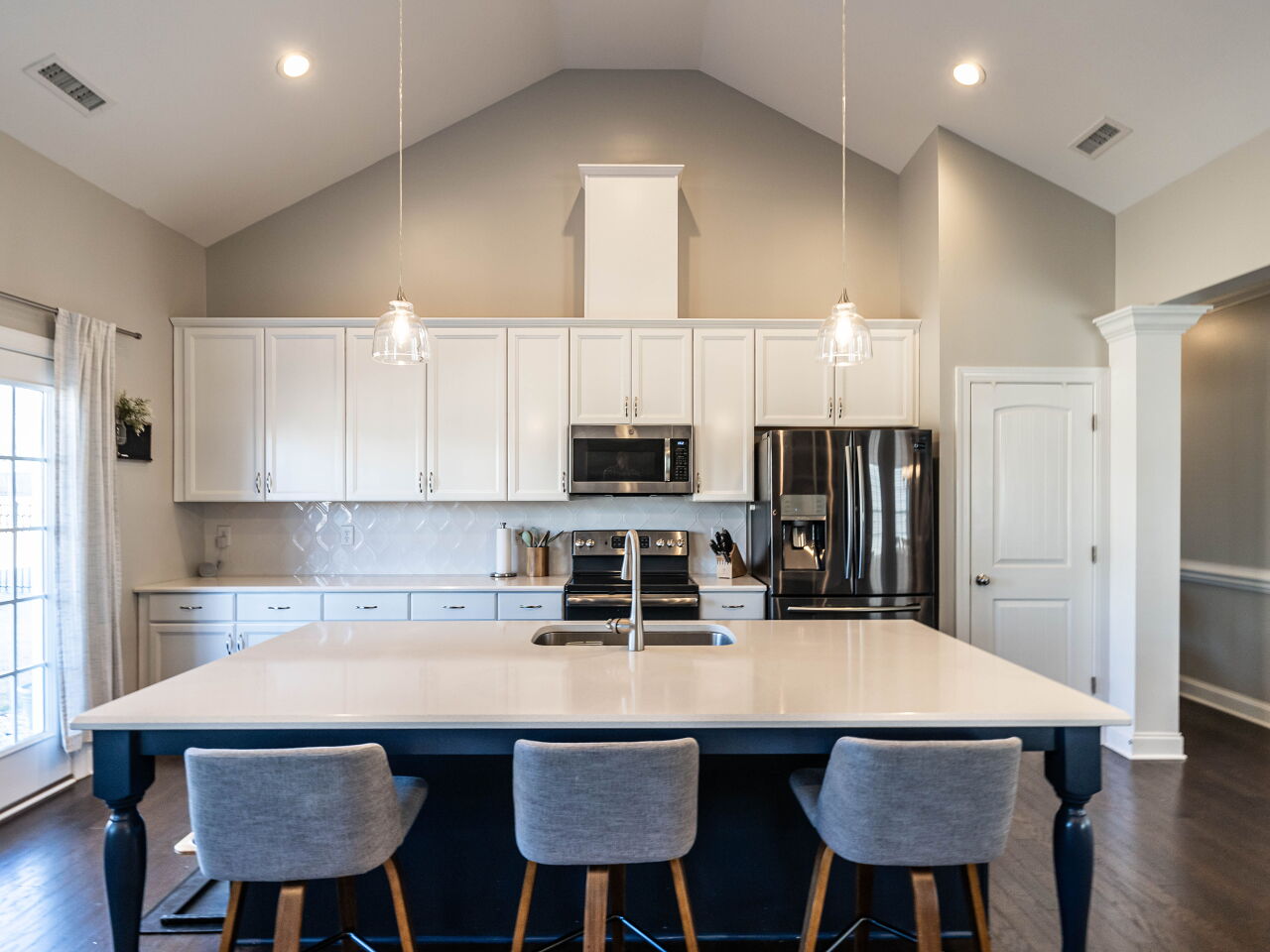 The kitchen – also with vaulted ceiling- is thoughtfully appointed with modern appliances, ample counter space, and storage solutions to meet all your needs. It affords a large kitchen island with seating, an adjacent dining room, and mere steps to your covered porch, allowing for effortless hosting! There are 2 bedrooms on the main level – including the primary with en-suite bath and huge walk-in closet.